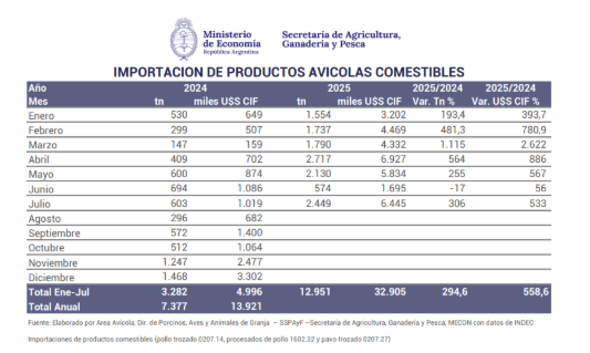 Solo en julio, con el levantamiento de la veda que tuvo Brasil por sus casos de influenza aviar, se reactivaron las compras desde ese país y se alcanzaron importaciones por 2.500 toneladas, volumen sólo superado en abril cuando se llegó a las 2.700 toneladas, según consta en los registros de la Secretaría de Agricultura. Todavía no están publicados los datos de agosto, pero se estima que el volumen sería similar.