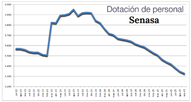Luego de un crecimiento de la plantilla de personal registrado en 2023, que alcanzó un máximo de 5954 trabajadores en agosto de 2023, desde el año pasado el Senasa comenzó a experimentar una reducción de personal, que se explica por desvinculaciones, cargos vacantes que no se renovaron y profesionales que dejaron el organismo al percibir salarios poco satisfactorios.