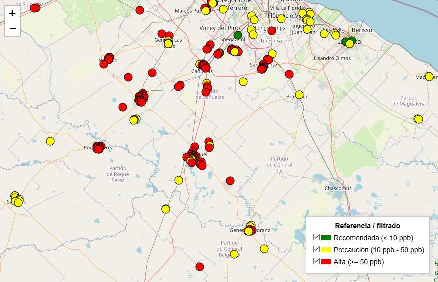 El ITBA determinó que el elemento supera la concentración máxima permitida en 12 distritos del interior y cuatro del conurbano. Una veintena están en alerta amarilla por superar el tope internacional.