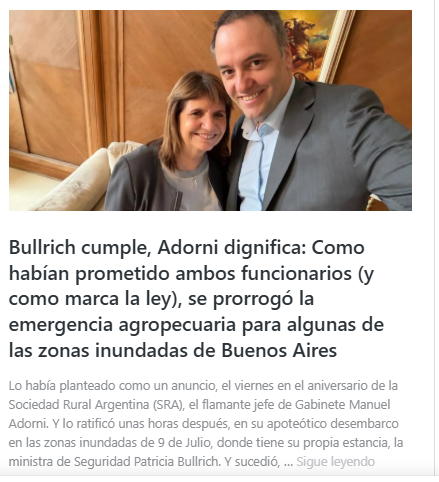 El sábado pasado, unos 500 productores aplaudieron a la ministra de Seguridad Patricia Bullrich por haberse acercado hasta 9 de Julio, tras 9 meses de estar inundados. La funcionaria hizo allí una batería de anuncios que para muchos dejó gusto a poco, y que con el correr de los días dejó gusto a casi nada.