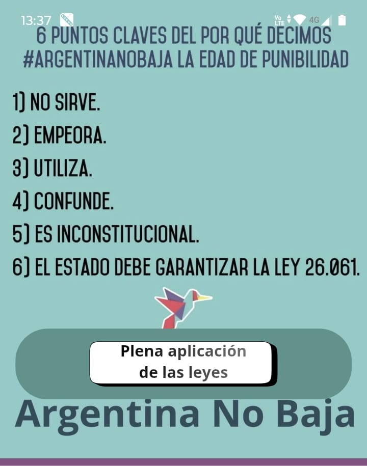 Los/as especialistas, organizaciones de derechos humanos y de niñez, sindicatos, académicos y juristas que conformamos la Red Argentina No Baja volvemos a decir que ES NECESARIO TRABAJAR CON LOS MÁS CHICOS PARA QUE TENGAN HORIZONTES DE VIDA FUERA DE LA VIOLENCIA Y QUE BAJAR LA EDAD DE PUNIBILIDAD ES UNA FALACIA, NO ES LA SOLUCION